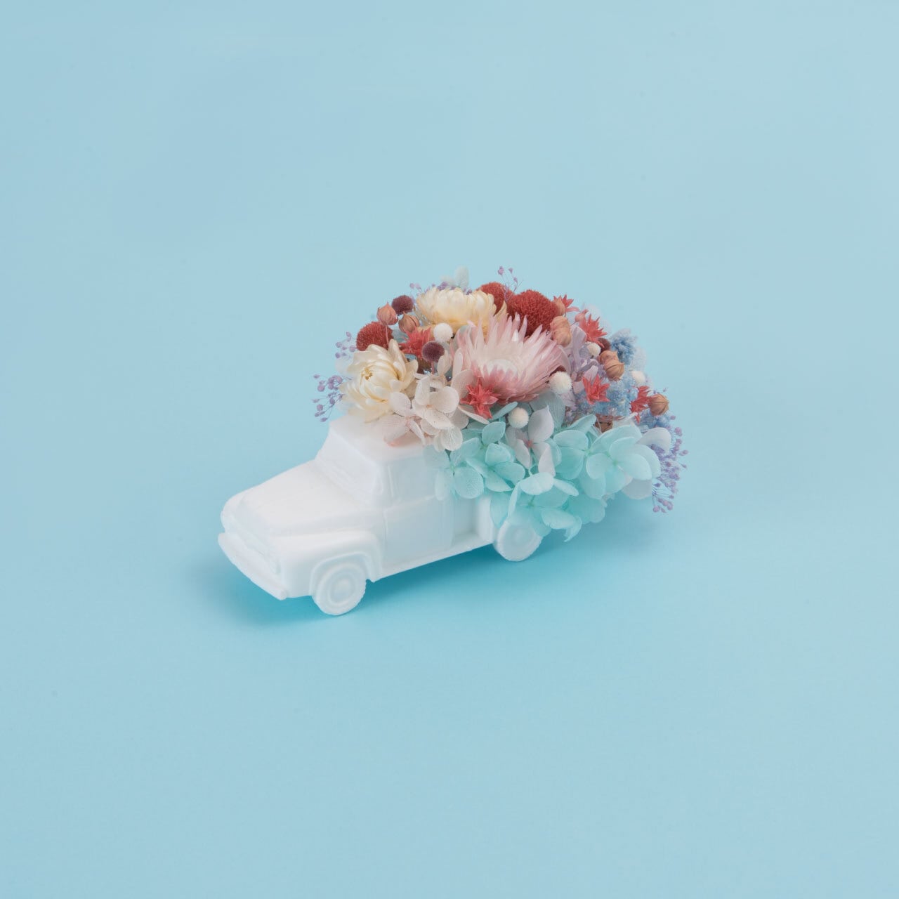 50'sアンティークキャリートラックを模ったモチーフの荷台にプリザーブドフラワーとアートドライフラワーを使用したカラフルなアレンジメントです。
